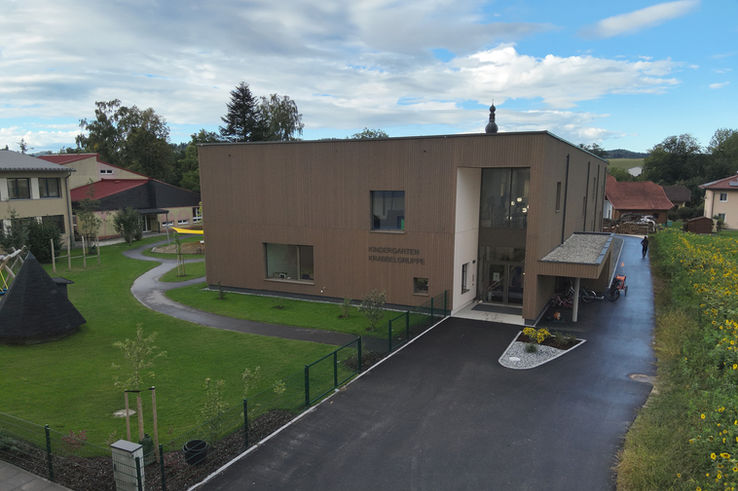 Der Kindergarten wird als zweigeschossiges Gebäude errichtet, welches vier Kindergartengruppen und eine Krabbelstubengruppe beinhaltet. Zusätzlich kann die Kinderbetreuungseinrichtung bei Bedarf um jeweils eine Gruppe erweitert werden. Das Gebäude wurde in Richtung Südosten ausgerichtet und öffnet sich dadurch zum angrenzenden Außenspielbereich.